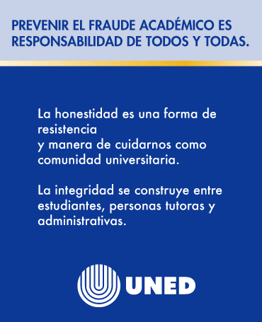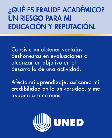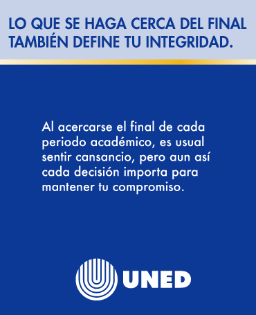 En la UNED creemos que tu integridad académica y tu esfuerzo constante son la base de tu éxito estudiantil. Durante estas semanas te vamos a compartir consejos, recursos y reflexiones para que sigás creciendo con ética, compromiso y confianza en tu trayectoria universitaria. ¡Acompañanos en esta campaña y construyamos una cultura de honestidad y logro académico!