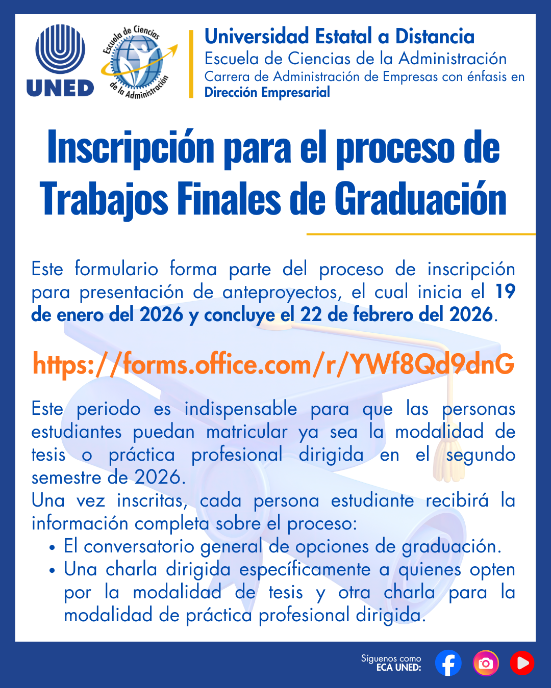 Este periodo es indispensable para que las personas estudiantes puedan matricular ya sea la modalidad de tesis o práctica profesional dirigida en el segundo semestre de 2026.