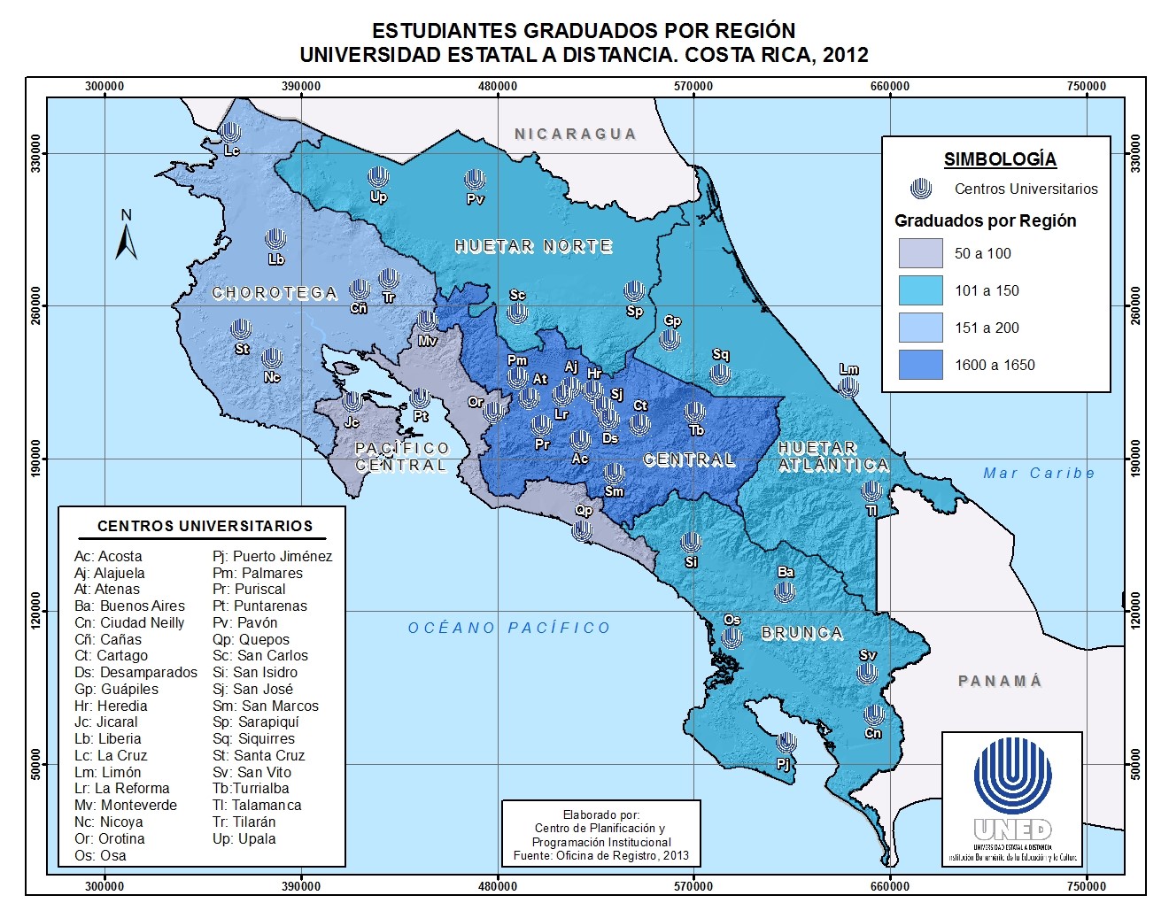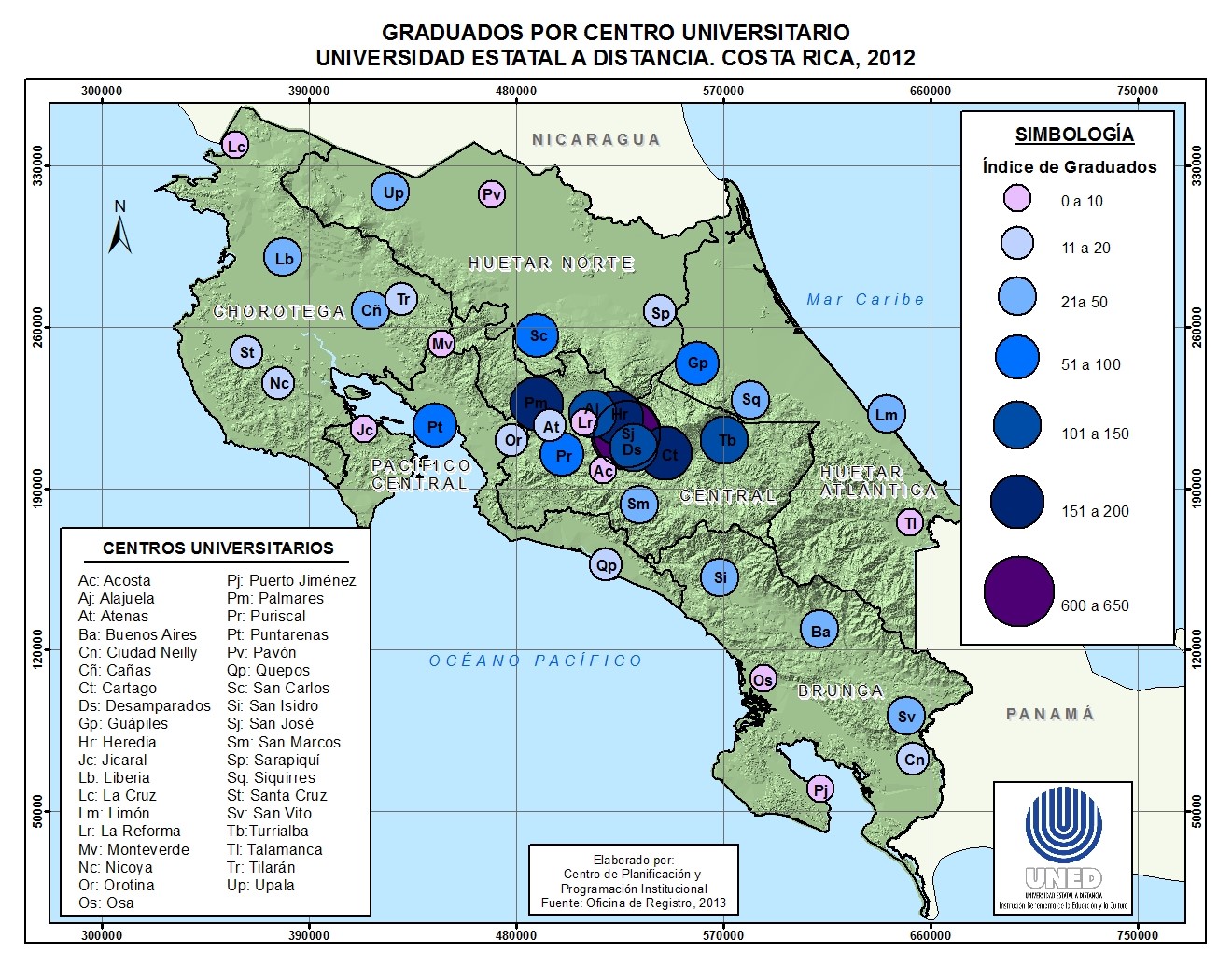 La distribución geográfica a nivel nacional de los graduados de la UNED por Centro Universitario muestra el alcance que posee la institución en las diferentes regiones del país. En el siguiente mapa se indica el índice de graduados, según Centro Universitario: