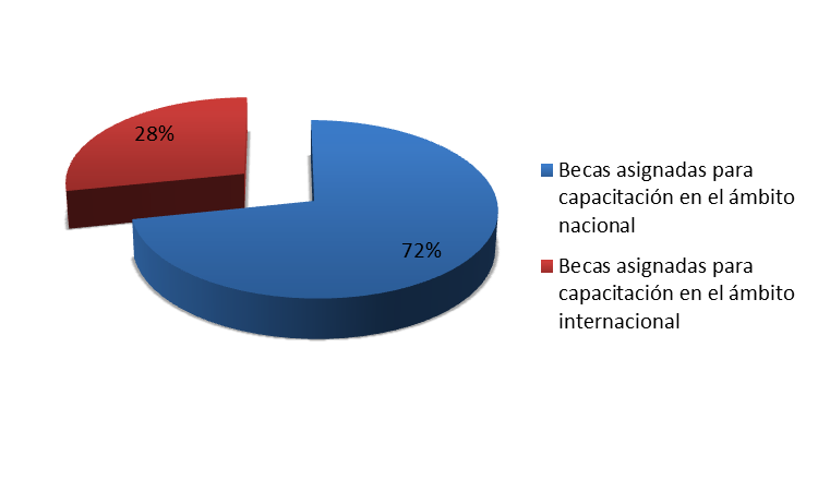 En el gráfico No. 4 se muestra la distribución porcentual de las becas asignadas para la participación de funcionarios en capacitaciones nacionales e internacionales, siendo 66 las becas para actividades nacionales y 26 para eventos internacionales (principalmente en congresos).
